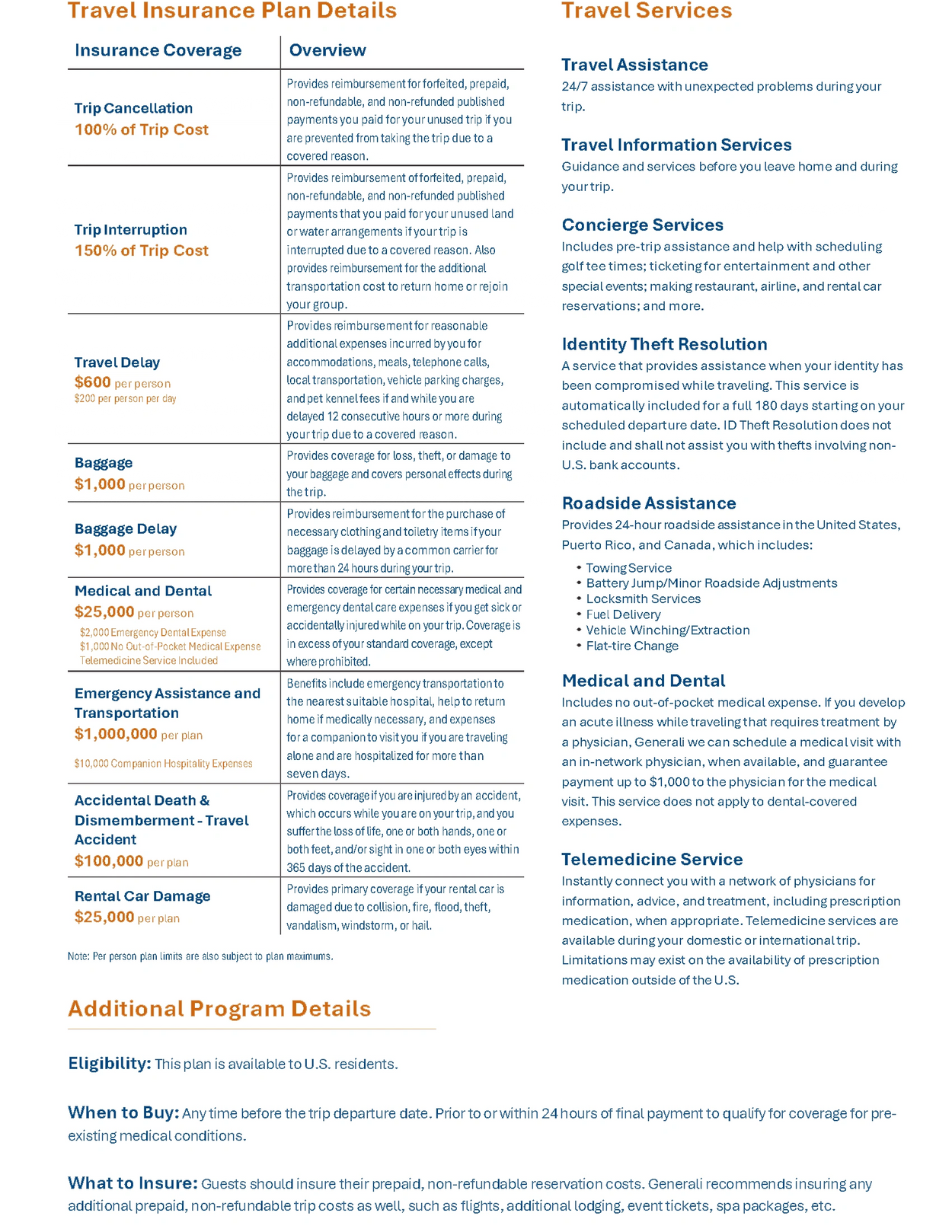 Includes no out-of-pocket medical expense. If you develop an acute illness while traveling that requires treatment by a physician, Generali we can schedule a medical visit with an in-network physician, when available, and guarantee payment up to $1,000 to the physician for the medical visit. This service does not apply to dental-covered expenses.